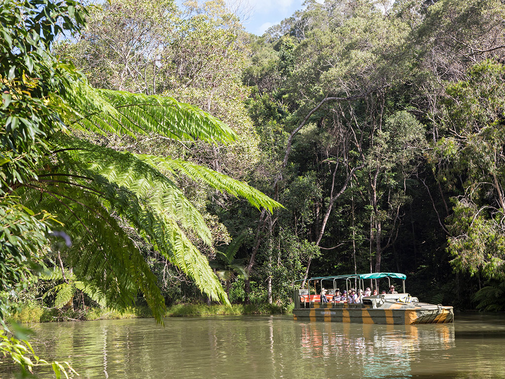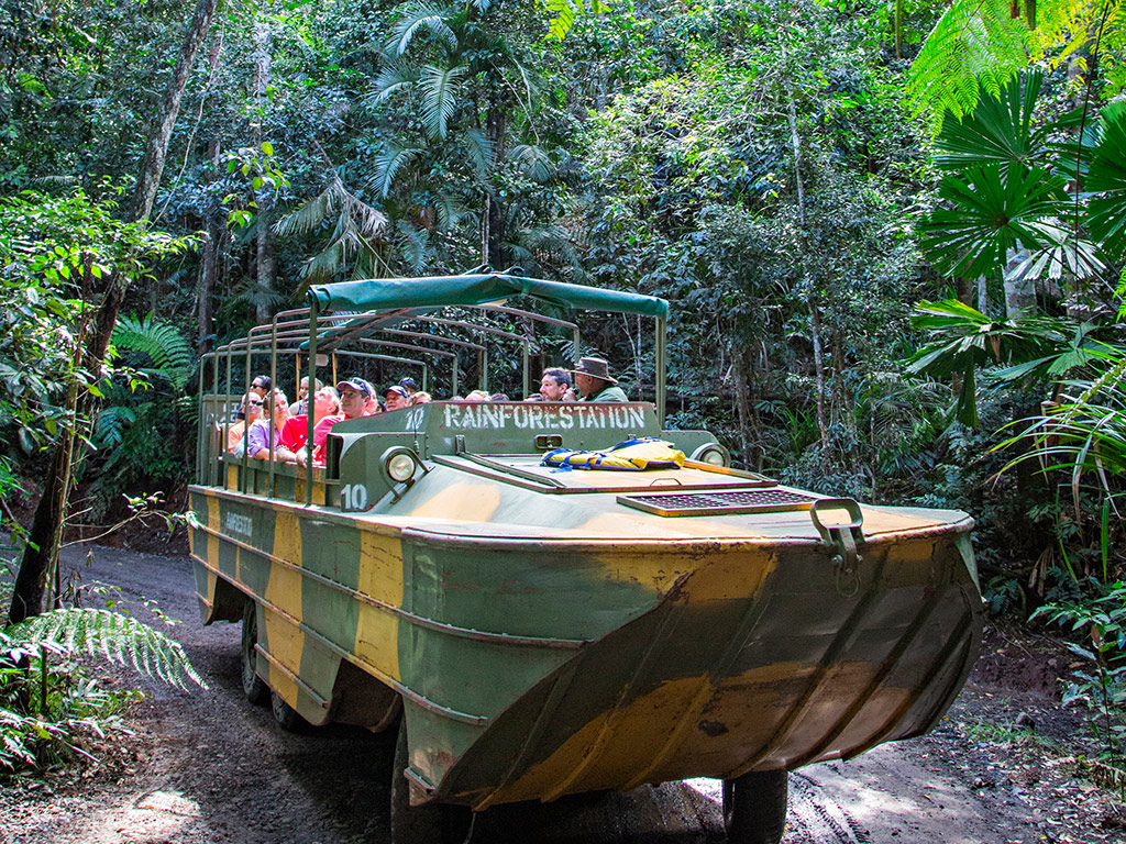 Board an amphibious World War II Army Duck for a land and water adventure through the rainforest, as your Duck Captain identifies and explains fascinating plants including ferns, orchids, strangler figs and the infamous stinging tree. As you move through the water, keep an eye out for turtles, fish, eels and water birds, or for birds, pythons and other reptiles on land. Experience takes approximately 1 hour. After disembarking, visit the Tropical Fruit Orchard, containing over 40 species of exotic tropical fruit trees. This tranquil setting provides the perfect opportunity to view and learn about fruits of the region and the world, including jackfruit, paw paw, lychees, carambola and star apple.