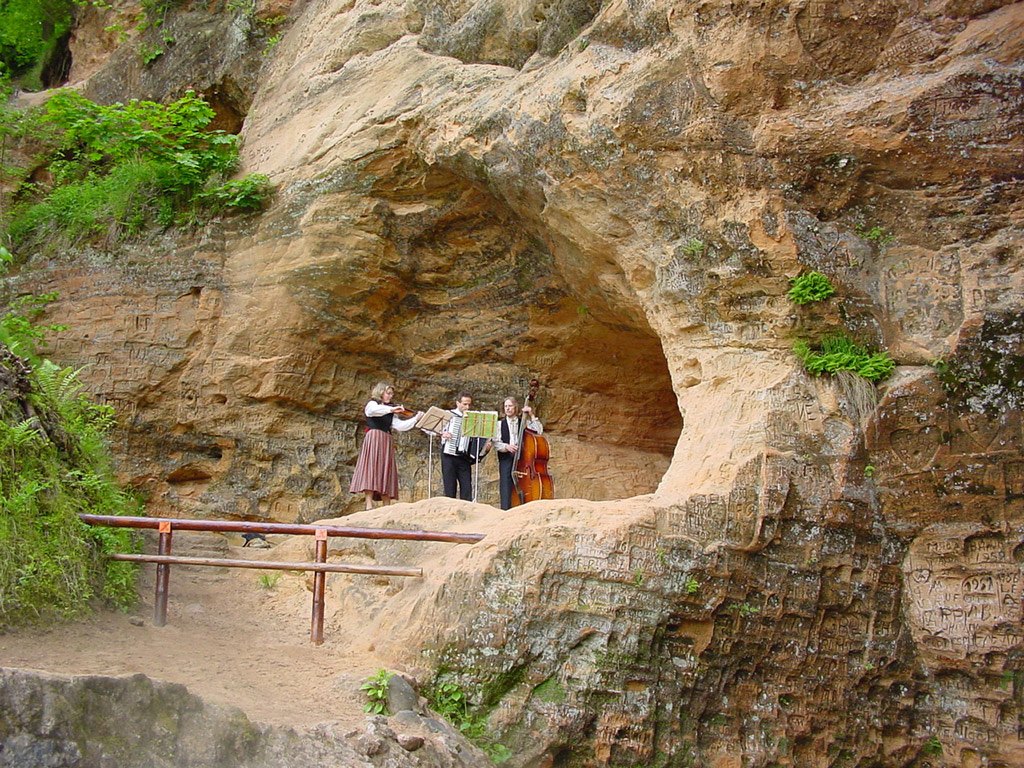 Tour furthers to the other side of the river and visit of the Gutman Cave, a huge red sandstone cave and then up to the hill the ruins of the Turaida Castle (entrance), which was inaugurated by Bishop Albert of Riga and completed in 1214 and remained untouched until 1776 when it was seriously damaged by a fire, but now a part of the castle has been rebuilt, it is again possible to enter the tower and the main building and close to the castle you will find a little wooden church from 1750, the Daina Hill sculpture park of Latvian folksongs, and not to forget - the Tomb of the "Rose of Turaida".