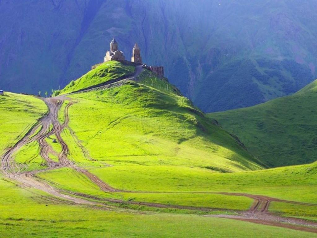 Gergeti Trinity Church- the oldest church is located under the Mount Kazbek, 2170m above the town of Stepantsminda (former Kazbegi) and village of Gergeti whose name she had adopted.