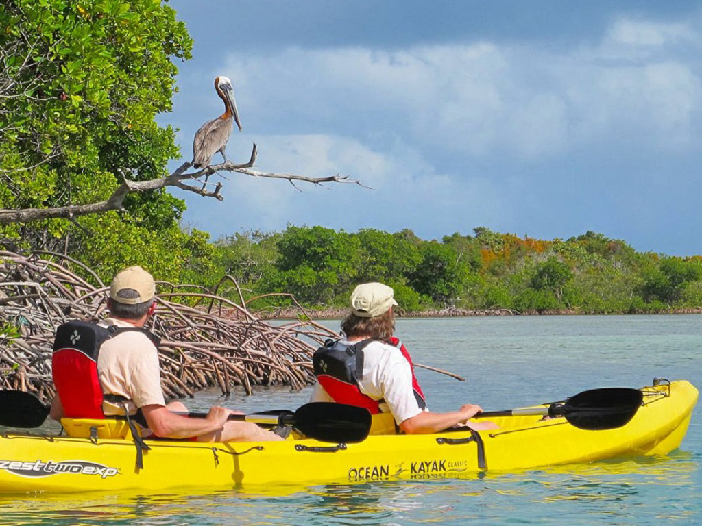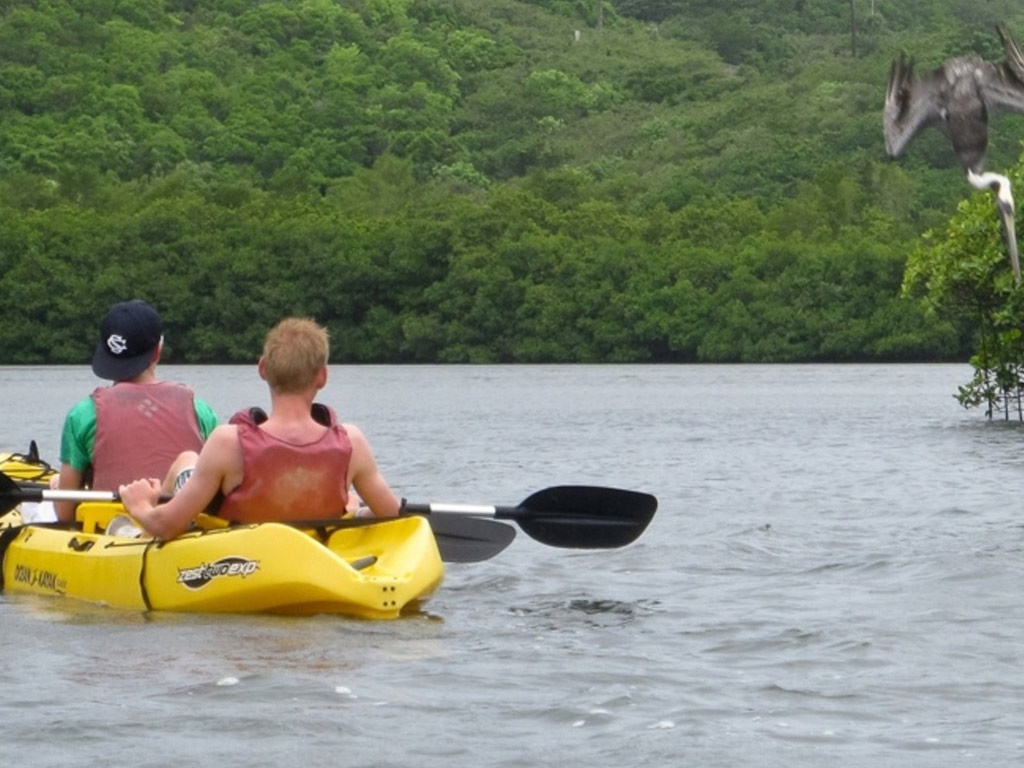Nature guides kayak with you through the protected Inner Lagoon Marine Preserve as you pass in between the many beautiful Manglar islands that are made up of red mangroves. Many birds nest in the trees, such as the endangered brown pelican, blue herons, night herons, egrets, yellow warblers, hummingbirds and many more. Juvenile fish hide among the many roots of the red mangrove trees.