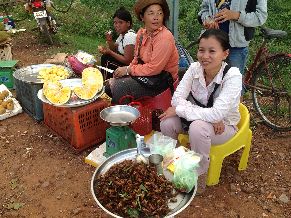 Next, we’ll hit up a local picnic spot where stalls are set up in the early evening selling a multitude of interesting snacks. As we wander around, you might see fried tarantulas, which are usually enjoyed with a cold beer; fried crickets, which taste like potato chips; barbecued meat on skewers; Khmer Fried Chicken; green mango served with chili and salt; ducks eggs; barbecued corn; and deliciously sweet purple mangosteen.