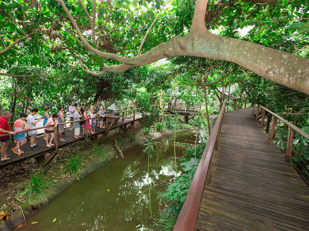 The Advanced Eco-accredited Wildlife Habitat is a wildlife immersion exhibit - an open and interactive environment for guests and animals to mingle in a spacious natural setting. Visitors wander along elevated boardwalks, observing up close a huge range of flora and fauna as birds fly and animals roam freely across 4 different environments: the rainforest, wetlands, grasslands and savannah.